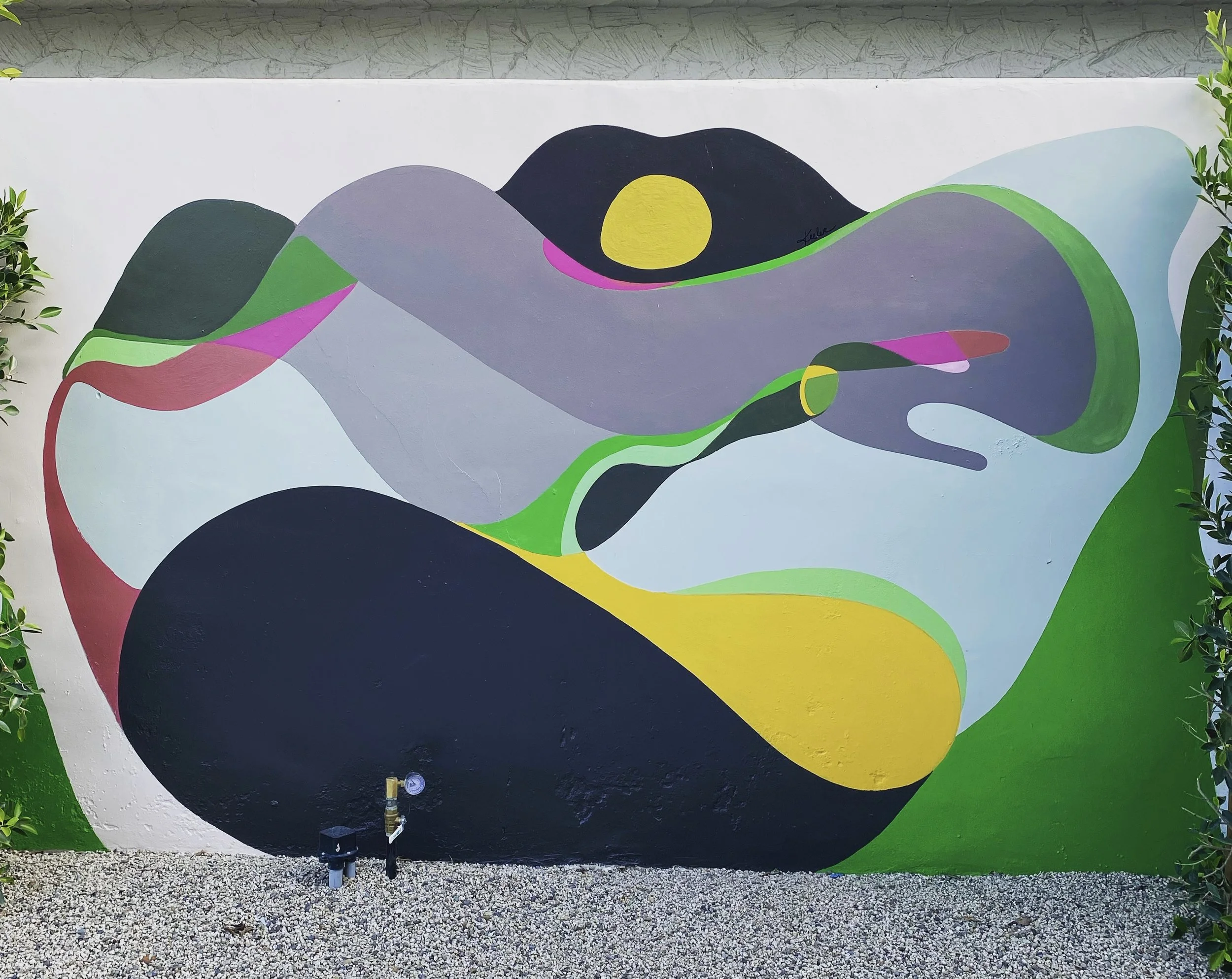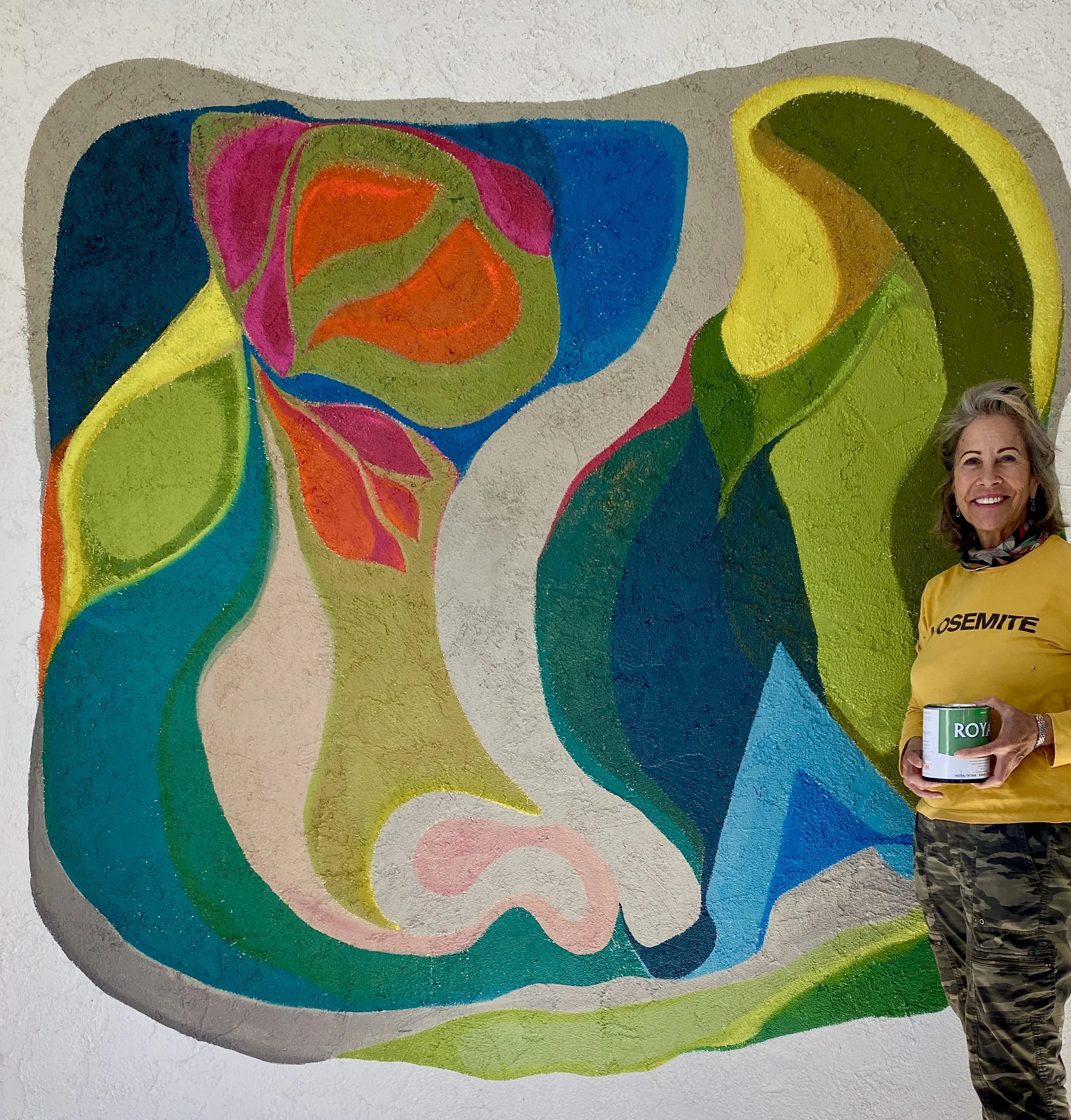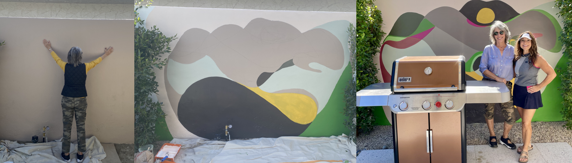 My good friend and uber talented designer Staci Munic wanted an exterior mural to anchor the wall on a side of her home that would be a background of an outdoor kitchen. I took inspiration from the bougainvillea flowers, the distant mountain range, the trees at Smoketree that you can see over her fence and an enormous grapefruit tree in the neighbor’s yard.