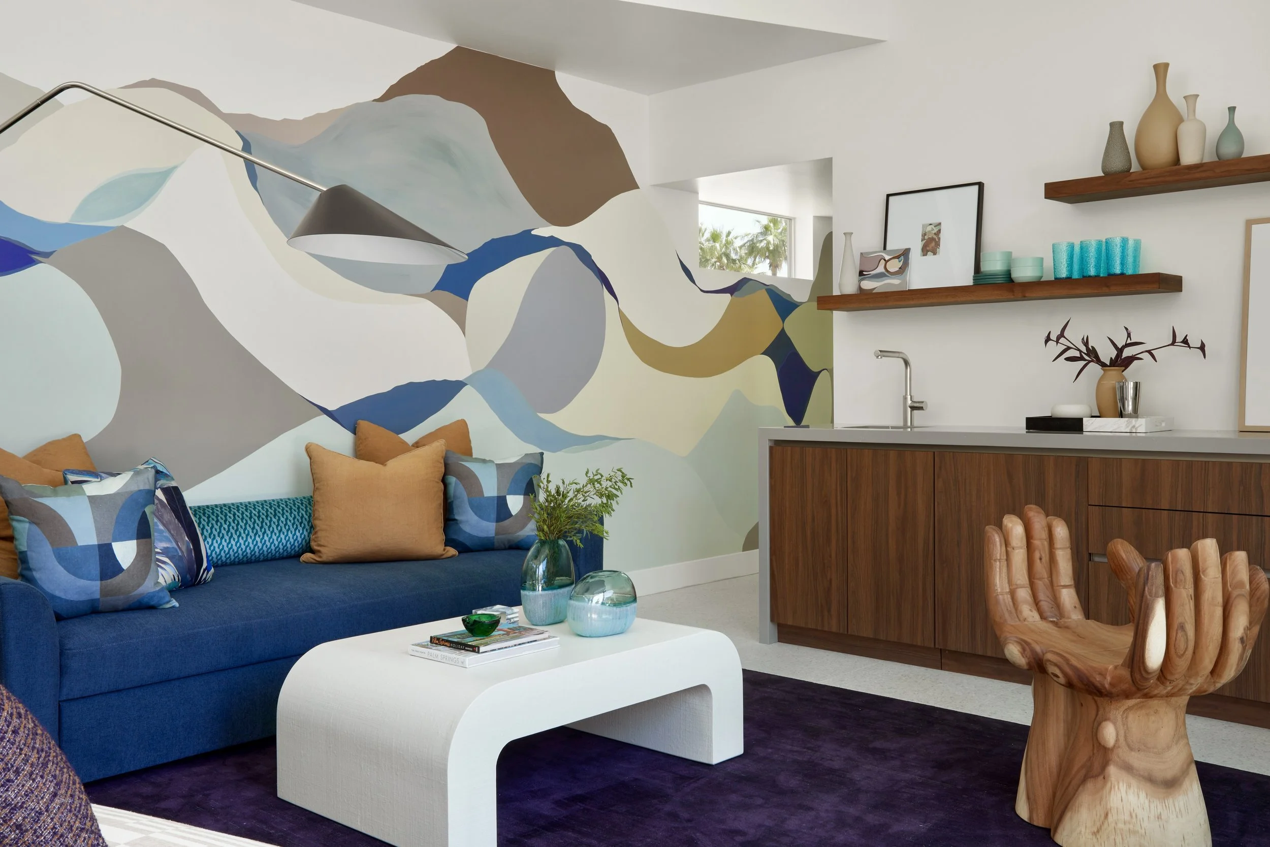 The interior designer Christopher Kennedy asked me to create a painted mural that would capture the exterior views seen through the sliding doors and clerestory windows in a newly built pool house. This artwork wraps around the walls and incorporates the colors and shape of the San Jacinto range of mountains and the ever changing skies.
